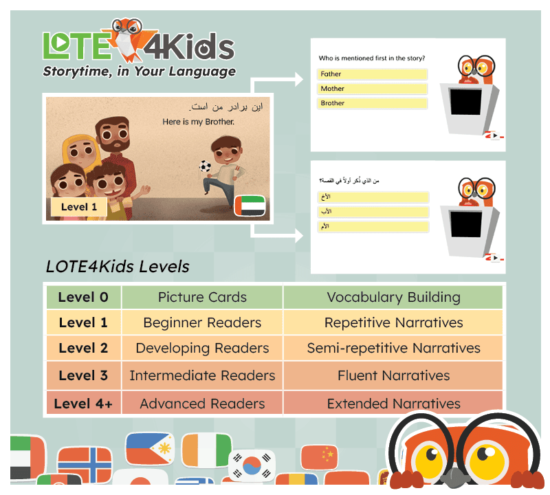 Bilingual readers, quizzes, and printable activities work in class or at home, with families accessing the platform via browser or free mobile app.